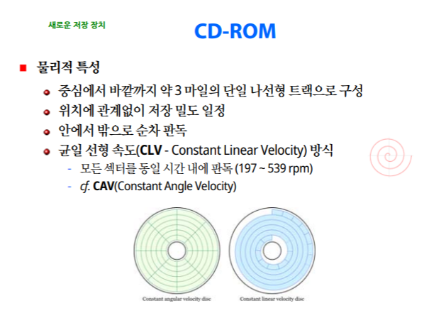 CLV : CD-ROM은 안에 읽는것을 읽을땐 빨리, 밖에 있는것은 느리게 읽는다 선형 장치이기 때문에 jump가 안되고 빙글빙글 돌아서 가야한다