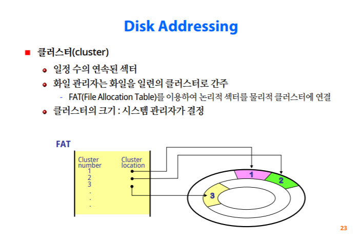cluster : 몇개의 블럭들을 묶어서 cluster단위로 주소를 부여하고, cluster단위로 데이터를 입출력한다.