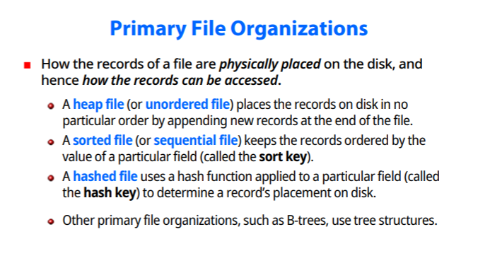 -heap file : record들이 disk에 첨가된 순서대로 저장된 방식