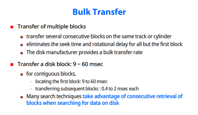 -탐구시간 최소화를 위해 한 블럭을 버퍼에 읽어 들이면 나머지 트랙도 같이 읽어들이게 함(랜덤블럭을 읽을땐 의미없다)