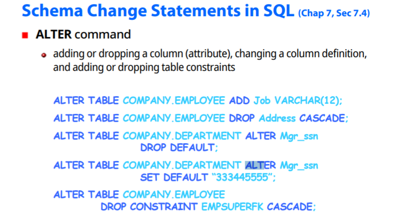 -기존에 있는 table에 새로운 column을 첨가하거나 지우거나 정의를 변경하거나 제약조건을 추가하거나 제거할 수 있는 명령어