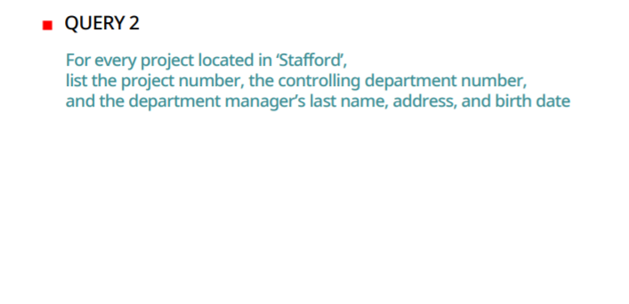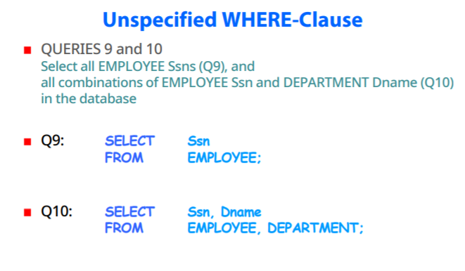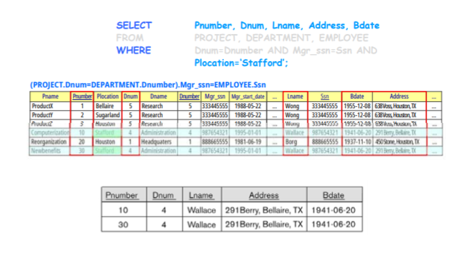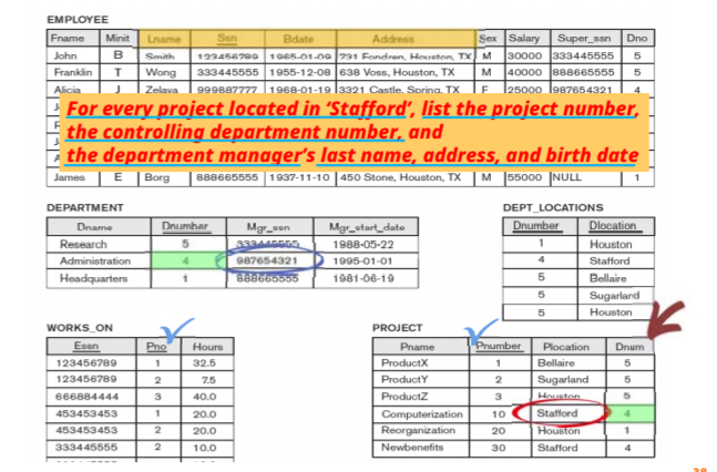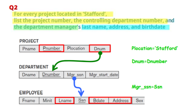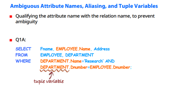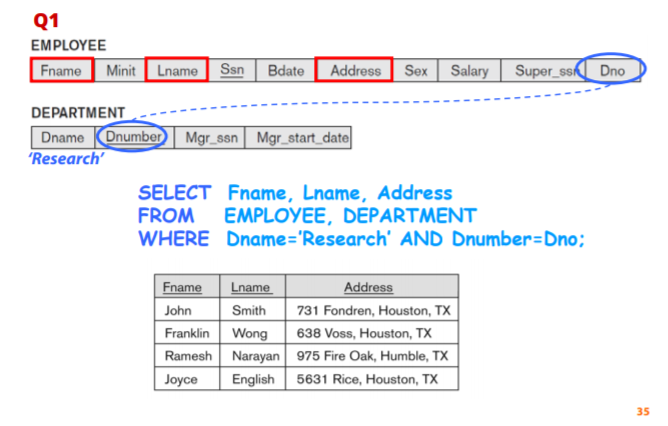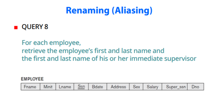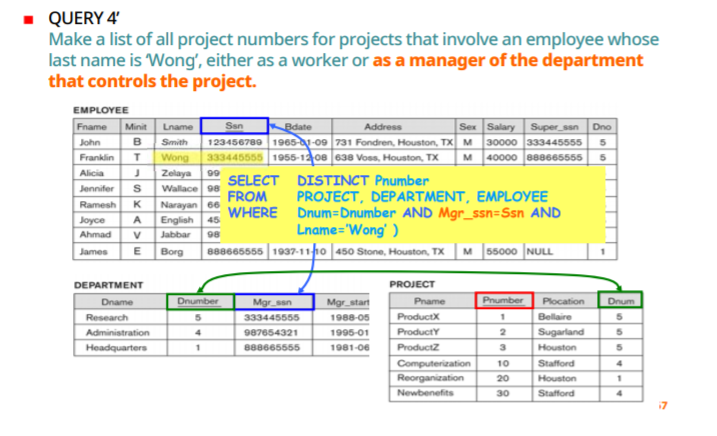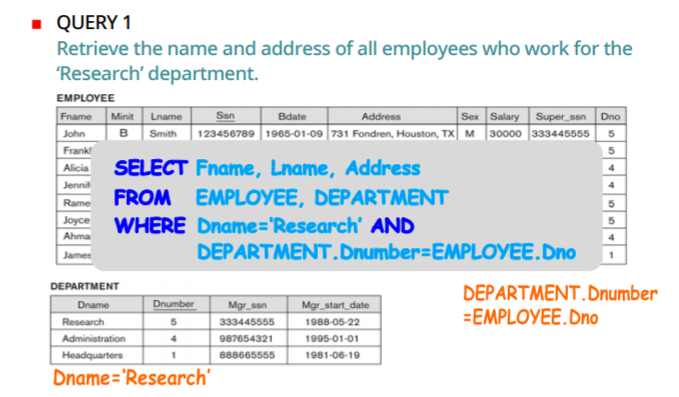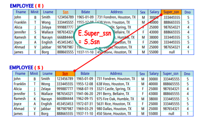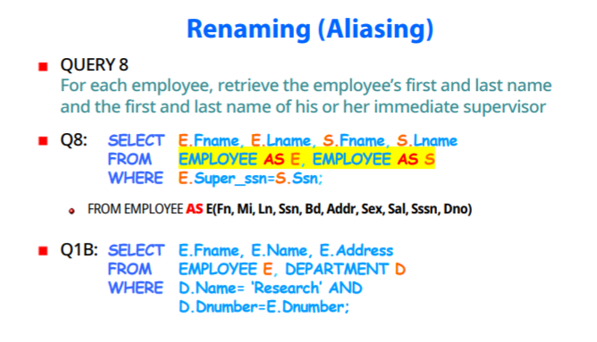 Research부서에 근무하는 직원의 이름과 주소 검색 , DEPARTMENT 테이블을 보고 Dno가 5인 사람을 찾으면 된다SELECT Fname, Lname, Address (Projection attribute) , FROM EMPLOYEE, DEPARTMENT , WHERE Dname='Research' AND DEPARTMENT.Dnumber=EMPLOYEE.Dno=>join condition이라고 부르고 WHERE문 조건 전체를 Selection condition이라고 부름. 이런 질의어를 join query라고 부른다. join query에서는 대부분 PK-FK관계로 결합되는 경우가 많고 그래야 문제가 생기지 않는다두번째 쿼리필요한 table은 3가지 (PROJECT ,DEPARTMENT, EMPLOYEE) PROJECT에서는 Pnumber, Dnum DEPARTMENT에서는 PROJECT의 Dnum으로 Dnumber을 찾아간뒤 EMPLOYEE에서는 DEPARTMENT의 Mgr_ssn으로 Ssn을 찾아간뒤 Lname, Bdate, Address를 찾는다.SELECT Pnumber,Dnum, Lname,Bdate,Address FROM DEPARTMENT,EMPLOYEE,PROJECT (순서는 상관 없다) WHERE Dnum = Dnumber AND Mgr_ssn = Ssn AND Plocation = 'Stafford'; (순서는 상관 없다)Attribute이름의 모호성 해결방법으로 Tuple 변수.Attribute.이름 으로 해결할 수 있다. 명확성을 위해 모든 attribute앞에 talbe변수명을 붙여주는것이 좋다고 얘기한다.쿼리 각 employee에 대해, employee의 first와 last name을 검색하고 직속 상사의 first와 last name도 검색해라. (Self-join-Query)동일한 내용을 갖는 두개의 table로 생각하면 쉽게 해결이 가능하다. (E) 와 (S)로 테이블을 구분지어 놓았다. SELECT E.Fname, E.Lname, S.Fname, S.Lname FROM EMPLOYEE AS E, EMPLOYEE AS S (AS를 이용해 별칭을 지어줌 생략가능) WHERE E.Super_ssn = S.Ssn; WHERE문을 명세 안함 = 모든 조합을 다 찾는다Astersisk ( * ) 사용 Attribute전체를 찾을 수 있도록 도와주는 의미