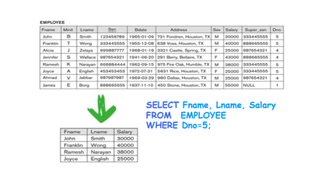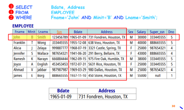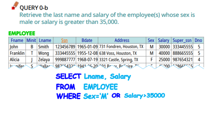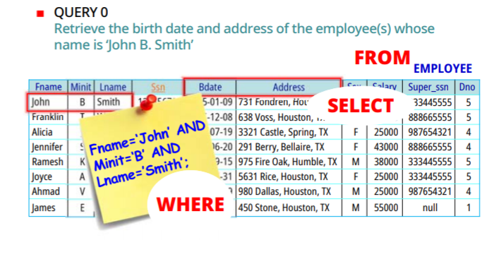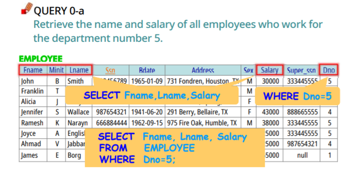 relationship relation (관계성 테이블) 각 Schema가 어떤 정보를 표현하고 어떤 관계를 갖는지 잘 알아야한다. John.B.smith의 생일과 주소를 찾아라= SELECT 생일, 주소 , FROM EMPLOYEE , WHERE 조건 테이블 찾고, 튜블 찾고, attribute 찾는 순서5번부서에서 일하는 직원의 이름과 급여를 찾는 질의( SELECT Fname,Lname,Salary FROM EMPLOYEE WHERE Dno=5남자거나 급여가 35,000보다 많은 사람의 last name과 급여를 찾는 질의 ( SELECT Lname, Salary FROM EMPLOYEE WHERE Sex=M OR Salary>35000)