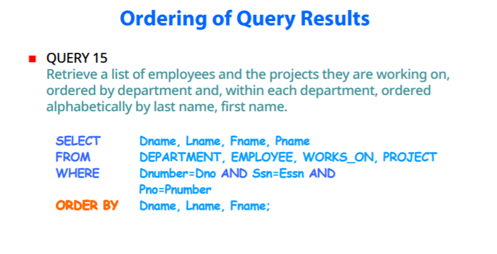 쿼리15 직원이 참여해서 일하는 프로젝트 이름을 부서순, 같은 부서내에선 이름순으로 정렬오름차순 ASC, 내림차순 DESC, default는 ASC