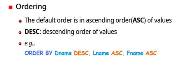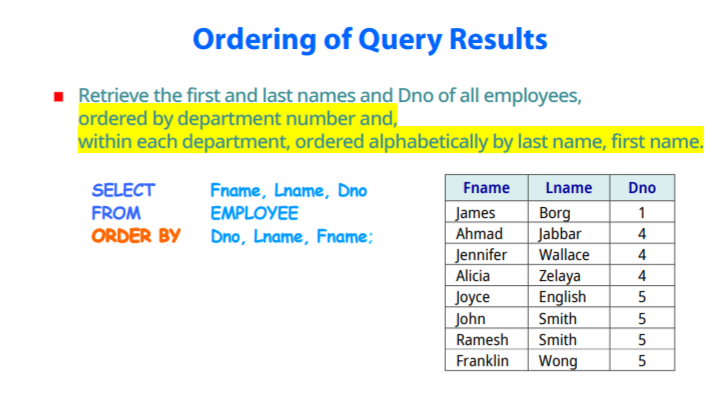 부서별 정렬, 같은 부서내에선 이름순 정렬을 하라고 조건이 주어질때 ORDER BY 절을 이용 => 정렬키들을 명세 한다. ( 부서 번호별 정렬후, 마지막 이름 순서로 정렬후, 첫번째 이름순으로 정렬) 결국 ORDER BY절은 결과값에 대한 정렬이기 때문에 SELECT와 같은 subset을 가진다.