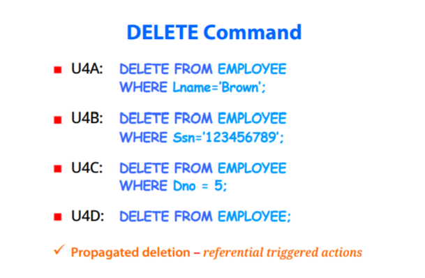 삭제명령 -Lname이 Brown인 employee 삭제 -Ssn이 123456789인 employee 삭제 -5번 부서 직원 삭제 -EMPLOYEE 전부 삭제(전체 table삭제) propagated deletion(연쇄 삭제) - referential triggered actions 문제가 발생할 수 있음 ㅠ