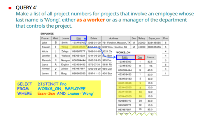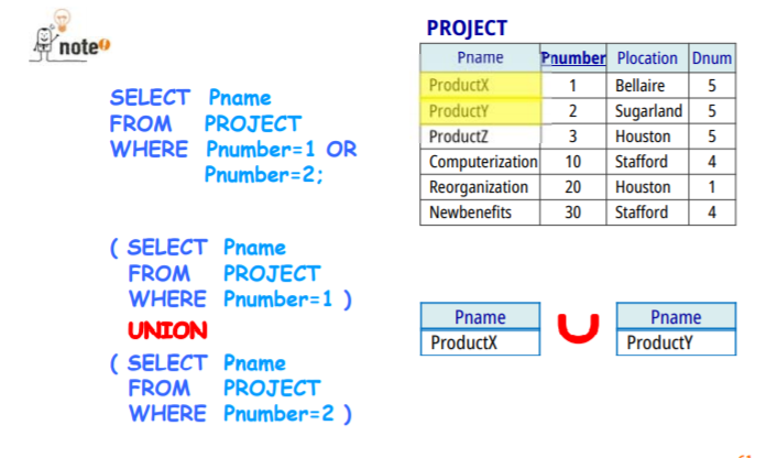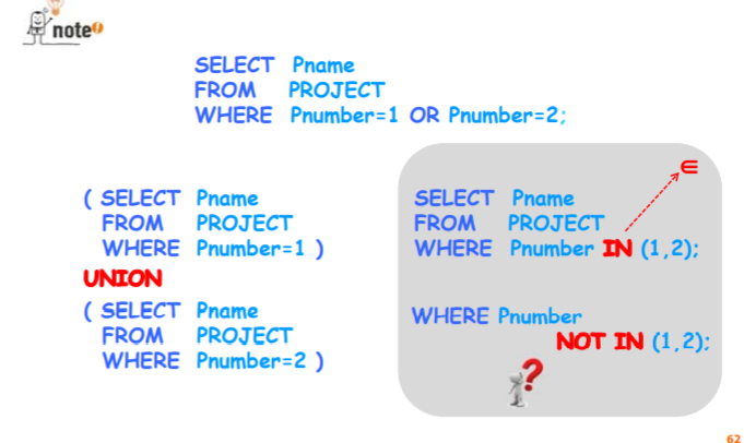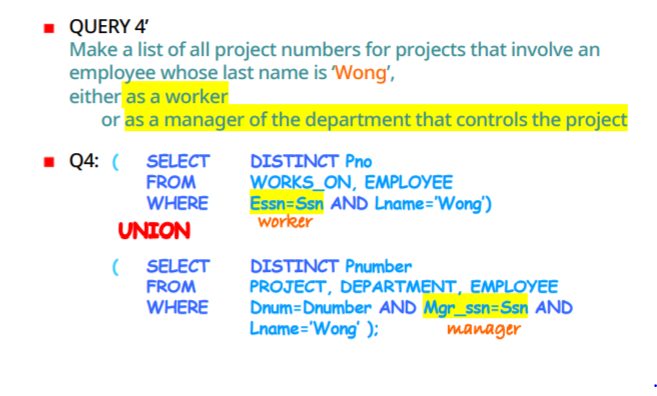 쿼리 11, ALL은 중복을 검색, DISTINCT는 중복을 제거하고 보여준다집합연산 합집합, 차집합, 교집합 그리고 합집합 전체, 차집합 전체, 교집합 전체 => 다중집합 연산UNION한 결과 두개를 UNION시 Attribute 구조가 같으면 UNION COMPATIBLE(결합가능) 이라고 한다.N이라는 기호는 왼쪽이 오른쪽에 있는 원소중 하나라면 TRUE, NOT IN은 포함되지 않는다면의 의미쿼리4 Wong이 worker로서 참여한 프로젝트 또는 부서의 매니저로서 관리하는 프로젝트 정보를 찾는 질의 worker, manager경우로 나눈뒤 UNION한다 Essn = Ssn은 join conditionWong의 Ssn으로 Mgr_ssn을 찾고 해당 Dnumber를 가지고 PROJECT의 Pnumber을 찾아간다.