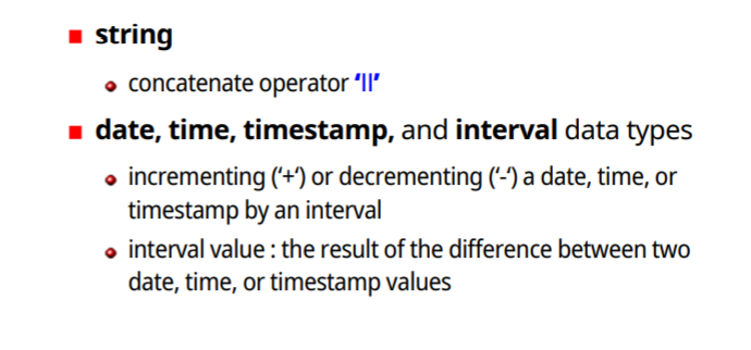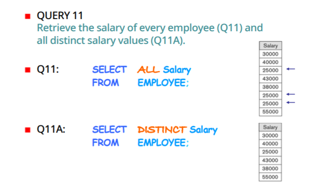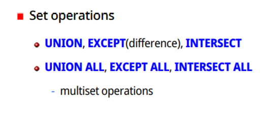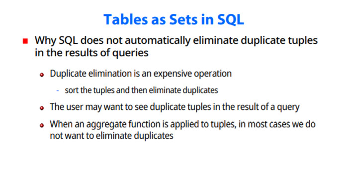 -SQL에서 테이블은 꼭 집합일 필요가 없어서 중복 튜플 생성되어도 자동으로 제거가 안됨(너무 비싼 연산 ㅠ, external sort) -유저가 중복튜플에 대한 정보를 원할 수 도 있음 -집단함수의 경우 중복을 제거 하면 안됨 그래서 SQL은 중복을 제거할지 말지 유저에게 선택권을 준다!