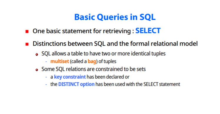 SQL은 table이 동일한 튜플을 갖는것을 허용하며 , relation은 집합이 아니구 중복을 허용하는 다중 집합구조이다. 하지만 일정 제약 조건 ( 키 제약조건, DISTINCT OPTION)으로 구분짓는게 가능하다 SELECT 검색할 column , from table명 , where 조건