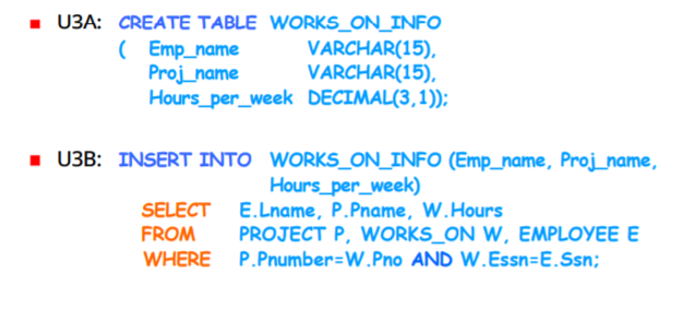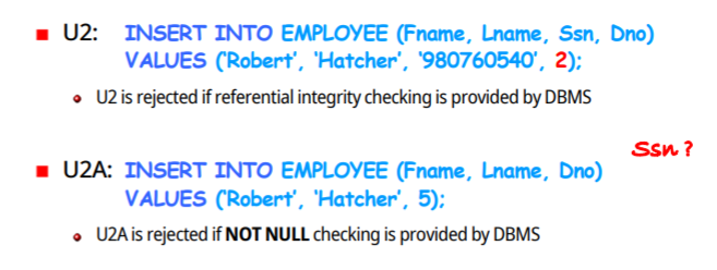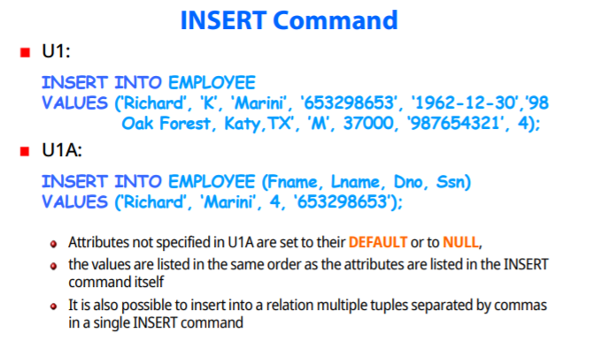U1 은 모든 EMPLOYEE에 새로운 행을 새로 삽입한다 모든 Attribute값 다 들어감! U1A 는 삽입하되 몇개의 정보만 넣기때문에 table옆에 삽입할 Attribute명을 써주어야한다. -명세되지 않은 값은 DEFAULT값이나 NULL값을 가짐 -Attribute 순서와 값은 순서가 맞아야함 -table 옆 Attribute의 갯수만큼 써주었다면 추가적으로 같은 방식으로 추가적 튜플 삽입가능