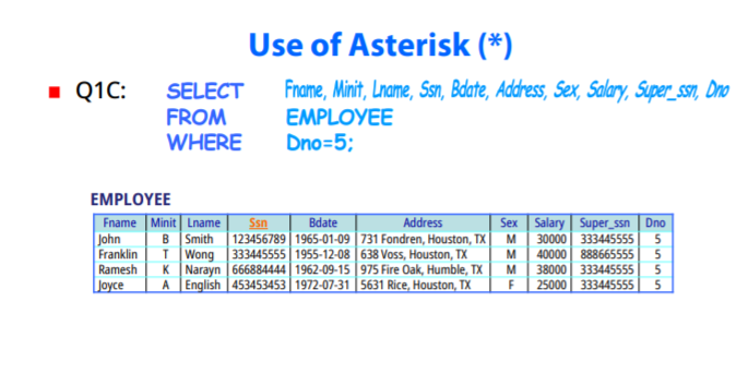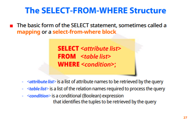 attribute list : 질의어를 통해 검색하고자 하는 attribute table list : 질의어를 통해 찾으려는 relation 이름 condition : 질의어를 통해 찾으려는 검색조건