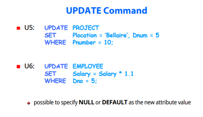 갱신명령 UPDATE,SET,WHERE UPDATE에 명시된 table에 WHERE조건을 만족하는 튜플의 SET조건대로 값을 바꿔준다 새로운 값에 NULL or DEFAULT도 명세 가능