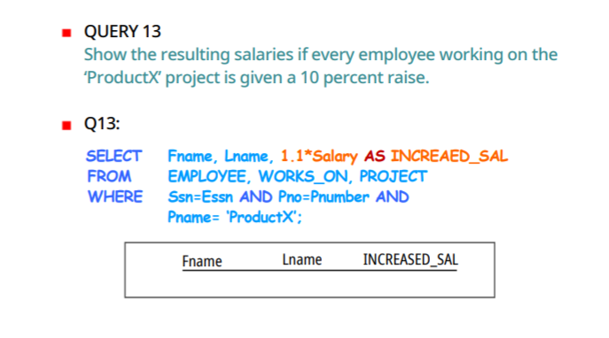 쿼리13 Product X 프로젝트에 참여한 직원의 급여를 10프로 인상시켜줬을때 결과값에 대한 질의 , 검색결과에 수식을 써줄수 있다(실제 데이터 값을 변경하는건 아니고 결과값만 표시해준다) 이 때 나오는 결과값은 Heading이 되지 않기 때문에 AS 를 이용해 이름을 지어주는 편이 보기좋다