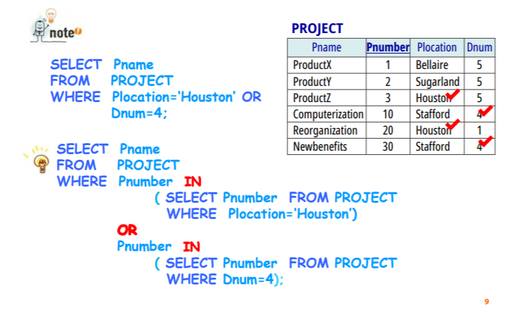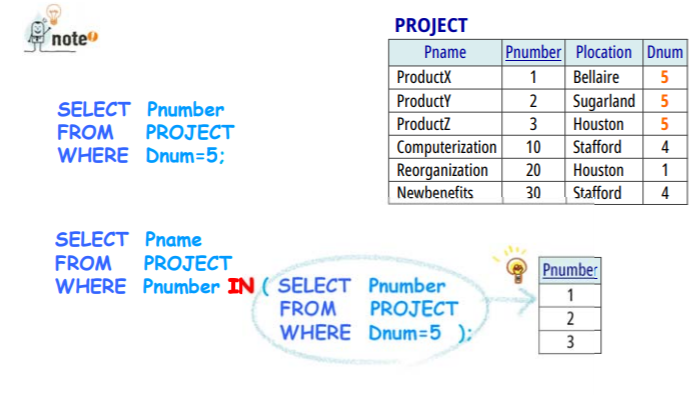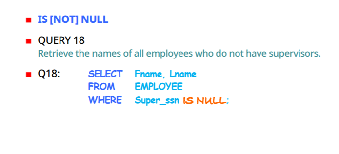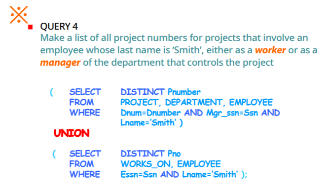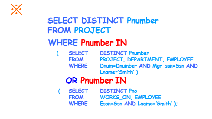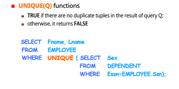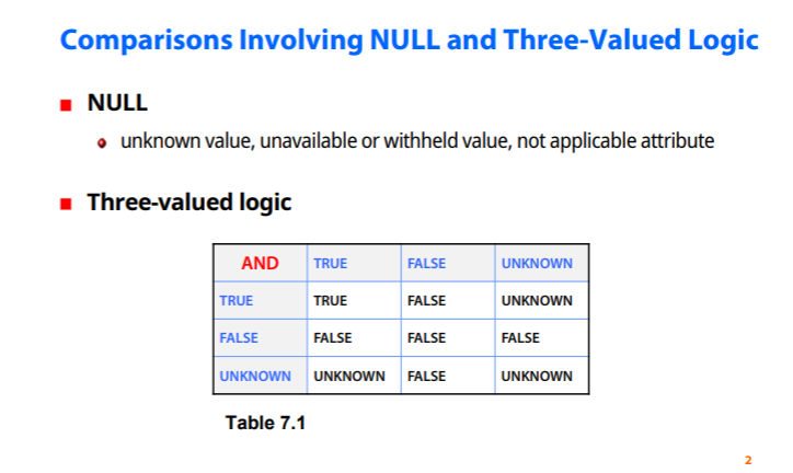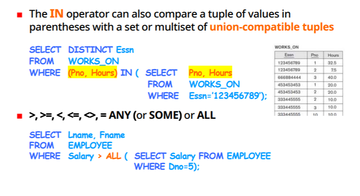 NULL을 포함한 비교와 3값 논리에 대한 비교 NULL : 모르는 값, 가용되지 않은 값 TRUE,FALSE와 UNKNOWN 의 AND연산값 주목 SQL에서 NULL값을 찾을때나 그 반대일때 = NULL 이 아니라 IS [NOT] NULL로 WHERE에 명세1,2,3 찾는 그림 Pnumber 1,2,3의 집합을 만들어 내는 쿼리문을 IN 으로 조건을 넣을 수 있다. ( 중첩 질의, sub query라고한다)몇겹이 되든지 DBMS마다 다른 한계를 둔다. 가장 바깥 질의어를 outer query 그 뒤 중첩들은 nested query or inner query 라고한다이미 number을 알고 있다면 다른 방식으로 표현할 수 있다는 것을 보여준다쿼리 4 스미스가 매니저로서 참여하는 프로젝트 넘버, 스미스가 worker로 근무하는 프로젝트 넘버를 찾는다이름은 다르지만 같은 Domain이므로 중첩 질의로 원하는 값을 찾을 수 있다.IN 앞의 집합과 중첩질의의 집합은 결합가능 즉 두 집합은 같은 구조여야한다. 부등호 연산에 대한건 별거없다inner쿼리와 outer 쿼리의 attribute이름의 모호성이 발생한다. 그래서 기본적 sql룰은 가장 안에 있는 table의 attribute로 간주를 한다.직원의 부양 가족 중 이름과 성별이 같은 직원을 검색하라는 쿼리 (Franklin만 존재)