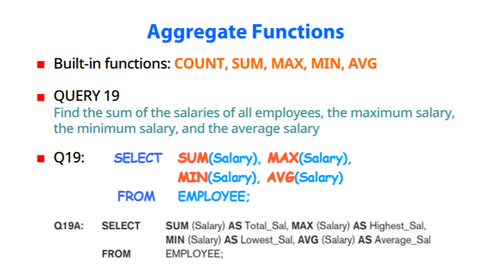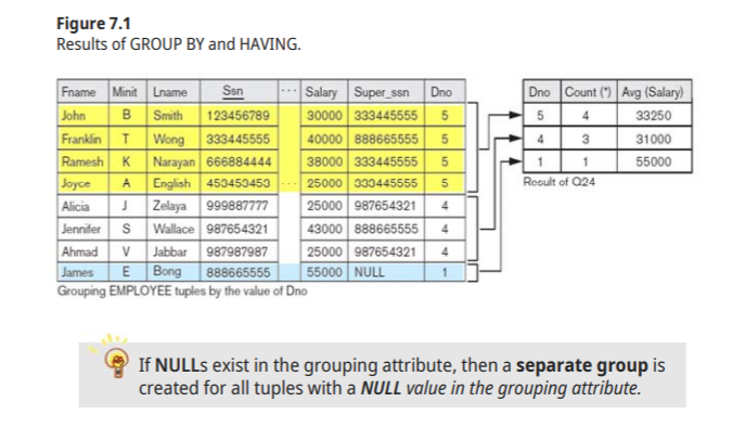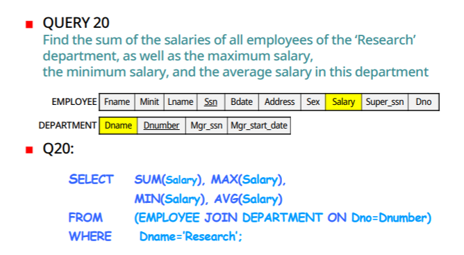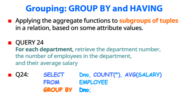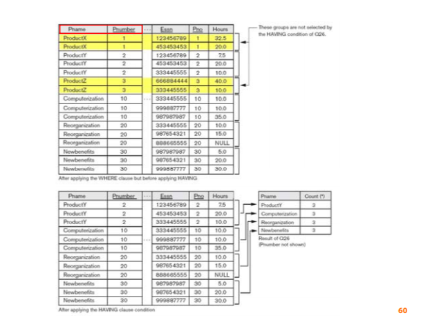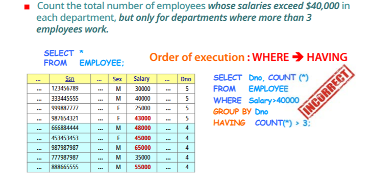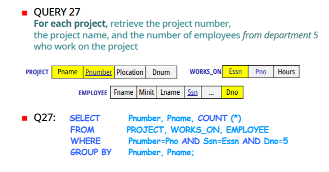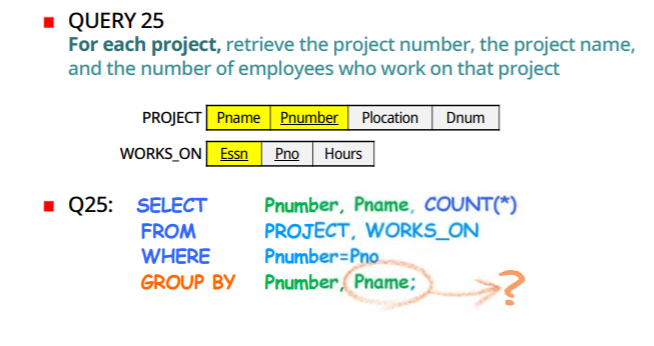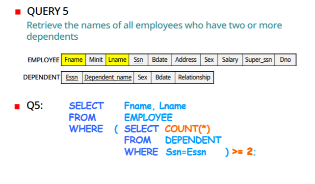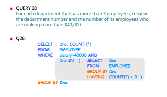 쿼리5 , 2명 이상의 부양가족을 갖는 직원의 이름 검색 COUNT를 이용해 WHERE문에 조건을 넣어 원하는 결과를 찾는 모습집단 함수를 그룹튜플을 만들어 사용 가능하다. 쿼리 24. 각 부서마다, 부서 번호를 찾고, 부서의 직원수를 찾고, 그들의 급여의 평균을 낸다. EMPLOYEE를 같은 Dno를 같는 사람들끼리 그룹을 형성 후, 그 그룹의 튜플수와 평균을 구한다결과값 내는 모습 , 그룹핑을 할때 NULL값이 있다면? NULL값을 갖는 것들끼리 그룹핑 하는 것이 아니라 각각 별도의 그룹으로 존재한다.각 프로젝트에 대해, 프로젝트 넘버, 이름, 그리고 일하는 직원수를 검색해라. (Pnumber가 PK기 때문에 굳이 Pname을 그룹핑 할 필요는 없지만 SELECT절에는 GROUP BY에 있는 attribute나 집단함수에 있는 attribute만 존재해야한다.두명 이상의 직원이 참가하는 프로젝트에 대한 쿼리25와 같은 정보를 알고 싶다 HAVING절 이용, 그룹핑을 한 후 필요없는 조건을 제거하는 역활을 한다.HAVING절 이용한 모습쿼리 27 각 프로젝트에 대해, 프로젝트 넘버,이름, 그리고 5번부서에 속한 직원들을 검색해라.3명이상 근무하는 부서의 부서번호와 그 중 각 부서에서 연봉이 4만불이 넘는 직원의 수를 계산해라. 그림 SQL쿼리의 순서가 중요하다. SQL은 WHERE절이 먼저, HAVING절이 나중에 적용되기 때문에 COUNT값이 왜곡이 된다.정답~
