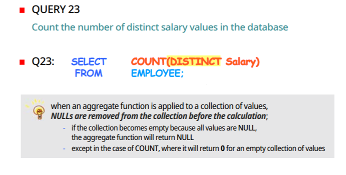 집단함수 적용시 NULL값 처리를 할때 문제가 발생, 집단함수는 값의 collection에 적용되기 때문에 NULL값은 계산시 처음에 아예 제거하고 카운트한다 -집합에 NULL값 뿐이면 NULL값을 돌려준다 -예외, COUNT함수의 경우 개수를 세는 것이기 때문에 0을 돌려준다.