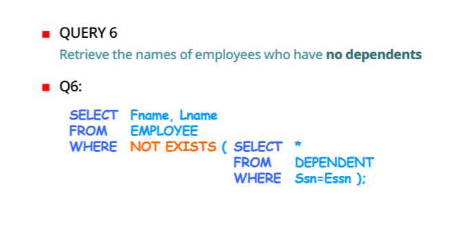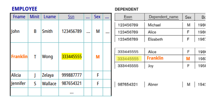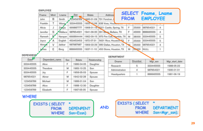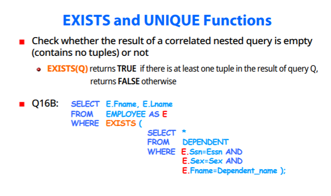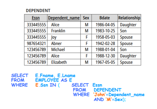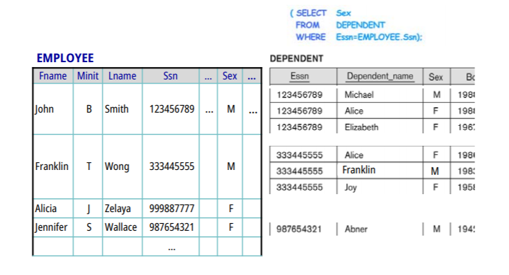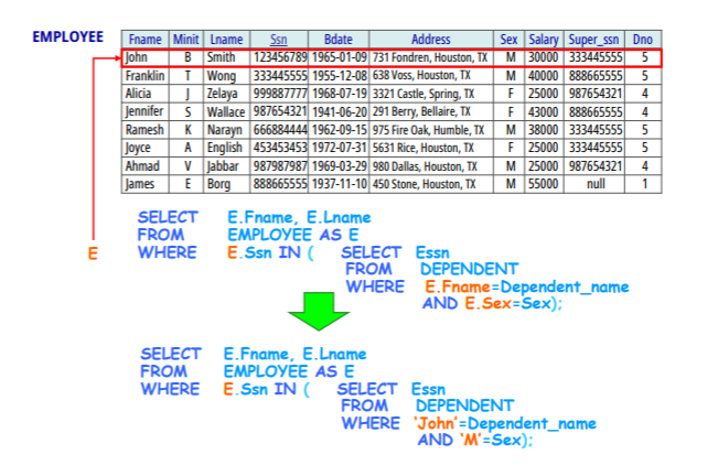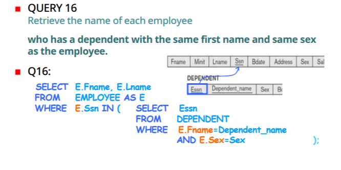 쿼리 16 직원이름 검색 후 그 직원의 부양가족 중 Fname과 성별이 같은 직원이 있는지 검색해보자쿼리 16 직원이름 검색 후 그 직원의 부양가족 중 Fname과 성별이 같은 직원이 있는지 검색해보자 , 쿼리문을 일단 순차적으로 접근해보면 주민번호를 검색할텐데 IN 내부의 조건은 직원의 Fname과 부양가족의 Fname 그리고 성별이 같은 사람만을 검색한다. (여기서 Sex는 두 테이블에 존재하여 혼동을 주지만 앞서 언급한 약속때문에 가장 안쪽의 table의 attribute가 된다)sub query입장에서 WHERE의 E.Ssn에서 E라는 table을 정해버렸기 때문에 그 후 table의 attribute들값들은 상수취급을 당한다는 내용이다. sub query는 outer query의 tuple 개수만큼 수행된다.