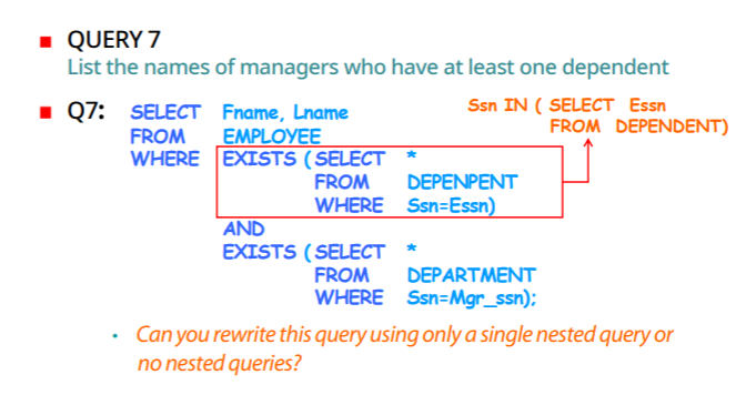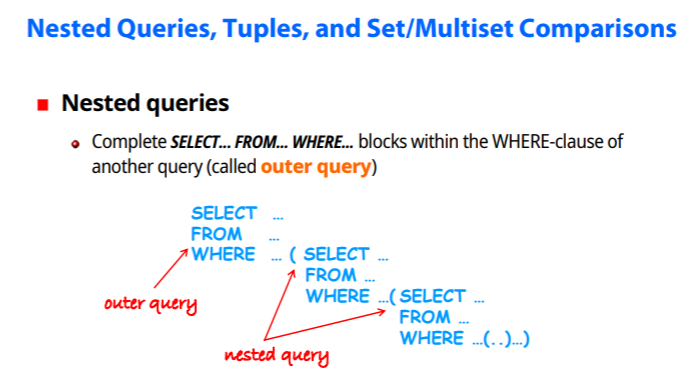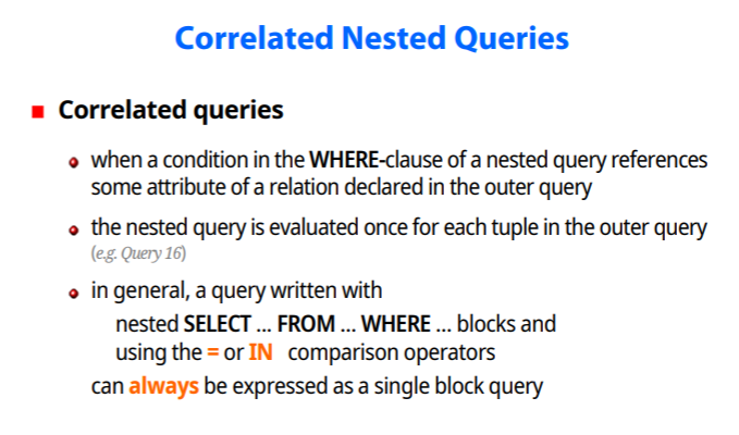 -outer query의 각 튜플마다 nested query가 수행된다 (비효율적) - = , IN 연산자를 포함하는 nested query는 single block query로 항상 바꿔줄 수 있다.