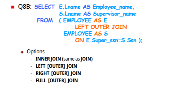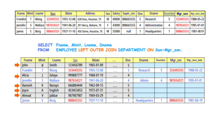 위는 inner join이 결과 , 아래는 outer join의 결과 , LEFT OUTER JOIN , EMPLOYEE 중에서 JOIN에 참가하지 못한 TUPLE들도 결과에 포함시켜라 (왼쪽)Q8B , LEFT OUTER JOIN의 예시