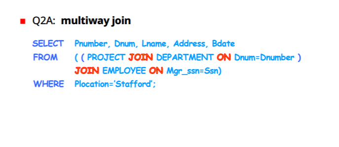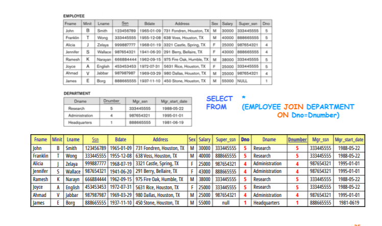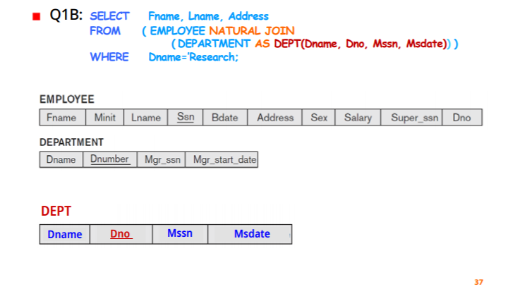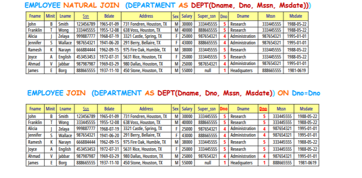 Dno와 Dnumber끼리 natural join 발생, natural join시 attribute 이름이 같지 않다면 같게 바꾸어야 한다.natural join시 결과가 중복이 없기때문에 깔끔해지고 찾기 편해진다.