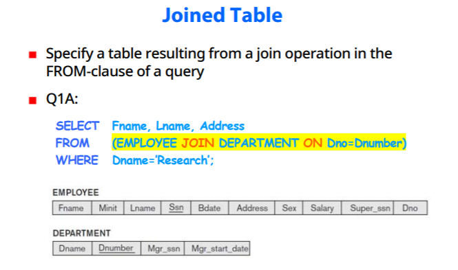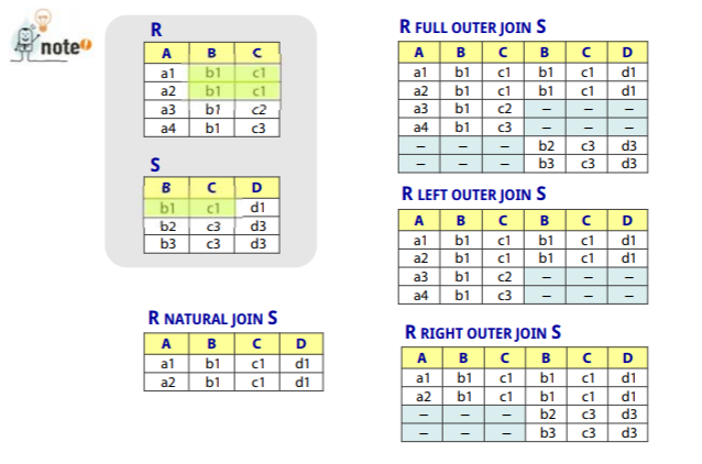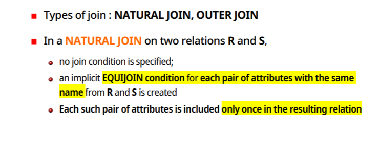 -JOIN을 하는 비교연산자가 '=' 인걸 EQUIJOIN이라 한다. -NATURAL JOIN은 이것의 특별한 형태이며 만약 두 테이블이 NATURAL JOIN이라면 attibutes 이름이 같은 것들은 튜플 내용이 동등해야한다. -결과에서도 어짜피 같기 때문에 attribute 집합이 한번만 나온다-.