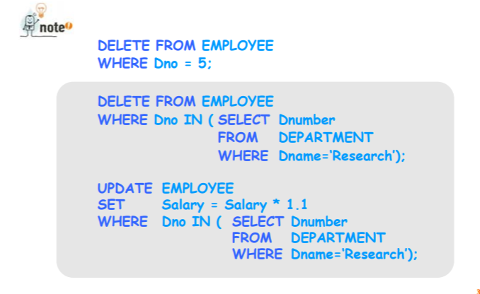 EXISTS 문 2개를 AND연산을 통해 교집합을 찾아낸다. Research 부서 사람들의 Dno를 모를때 그것을 찾아내 사용하는 쿼리문을 보여준다. nested query를 이용한 delete , update 사용하는 모습.Renaming attribute 해주는 모습 (재작명)