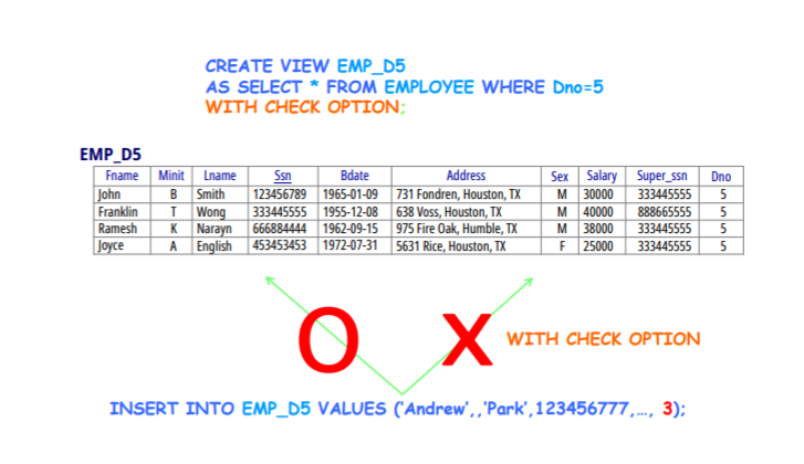 view를 정의할때 view 정의에 어긋난 연산은 허용하지 않겠다 ( 사용자 정의)