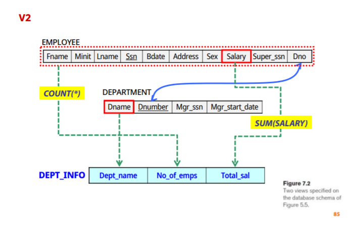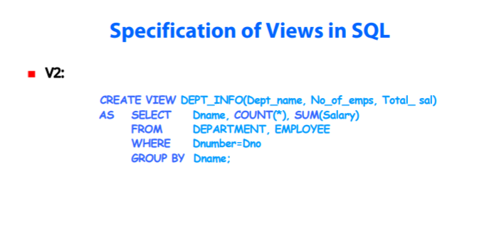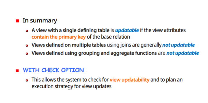 일반적으로 View에 대한 갱신은 집단함수가 적용되지 않은 단일 테이블에 대해서만 가능하다.