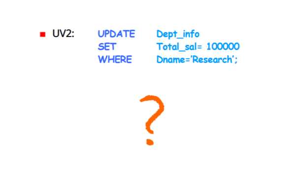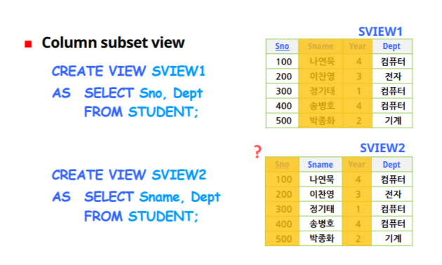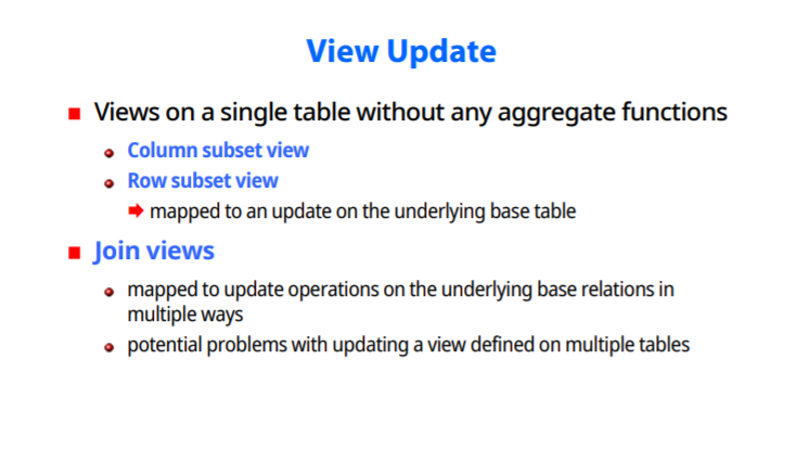 일반적으로 dbms는 Column subset view, Row subset View 두개에만 업데이트를 허용한다. ( 나머지는 금지)