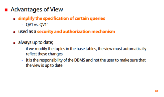 적당한 뷰를 정의함 으로써 볼 수 있는 권한을 제한시키는 장점이 있다.