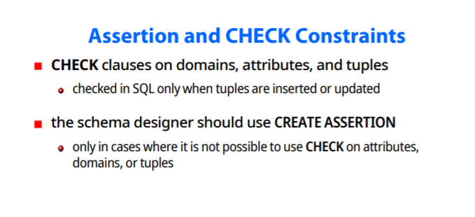 -CREATE ASSERTION은 관련된 tuple이 업데이트 될때마다 CHECK를 한다. 그렇기 때문에 Schema를 설계하는 사람은 가능하면 CHECK문을 쓰고 어쩔 수 없는 경우에만 ASSERTION문을 쓴다